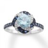 A mesmerizing display of color makes this engagement ring a truly stunning symbol of love. Ribbons of blue sapphires and shimmering round diamonds swirl outward from the aquamarine center, while more blue sapphires decorate the band. The 14K white gold ring has a total diamond weight of 1/15 carat.